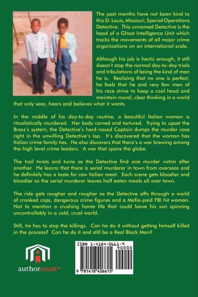 The past months have not been kind to this ST. Louis Missouri Special Operations Detective. This unnamed Detective is the head of a Ghost Intelligent Unit. His Unit tracks the movements of all major crime organizations on an international global scale. Although his job is hectic enough it still doesn't stop the normal day to day trails and tribulations of being the type of man that he try's to be. Knowing that no one is perfect he feels that he and very few men of his race. Strive to keep a cool head and maintain good morale clear thinking. In a world that only sees, hears and believes only what it wants to. In the middle of his day to day routine a beautiful Italian woman is ritualistically murdered. Her body carved and torch red. Trying to upset the Brass's system. The Detective's hard nosed Boss dumps the murder case right in the unwilling Detective's lap. Its discovered that the woman has Italian crime family ties. He also discovers that there's a war brewing among the high figure crime leaders. A war that spans across the oceans. The trial twists and turns as the Detective finds one murdered victim after another. He learns that there's a serial murderer in town from over seas and he defiantly has a taste for raw Italian meat. Each scene gets bloodier and bloodier as the serial murderer leaves half eaten meals all over town. The ride gets rougher and rougher as the Detective sifts through a world of crooked cops. Dangerous crime members and a paid mafia F.B.I. Hit woman. Not to mention a crashing home life that will leave his son spinning uncontrollably in a cold cruel world. Still he has to stop the killings. Can he do it without getting his self killed in the process. Can he do it and still be a real black man.