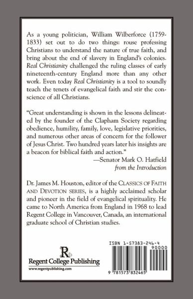 As a young politician, William Wilberforce (1759-1833) set out to do two things: rouse professing Christians to understand the nature of true faith, and bring about the end of slavery in England's colonies. Real Christianity challenged the ruling classes of early nineteenth-century England more than any other work. Even today Real Christianity is a tool to soundly teach the tenets of evangelical faith and stir the conscience of all Christians.