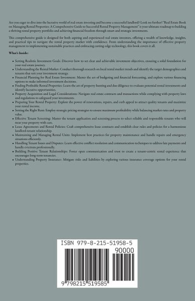 Are you eager to dive into the lucrative world of real estate investing and become a successful landlord? Look no further! "Real Estate Book on Managing Rental Properties: A Comprehensive Guide to Successful Rental Property Management" is your ultimate roadmap to building a thriving rental property portfolio and achieving financial freedom through smart and strategic investments. This comprehensive guide is designed for both aspiring and experienced real estate investors, offering a wealth of knowledge, insights, and practical tips to navigate the rental property market with confidence. From understanding the importance of effective property management to implementing sustainable practices and embracing cutting-edge technology, this book covers it all. What's Inside: Setting Realistic Investment Goals: Discover how to set clear and achievable investment objectives, ensuring a solid foundation for your real estate journey. Understanding the Rental Market: Conduct thorough research on local rental market trends and identify the target demographics and tenants that suit your investment strategy. Financial Planning for Real Estate Investment: Master the art of budgeting and financial forecasting, and explore various financing options to make informed investment decisions. Finding Profitable Rental Properties: Learn the art of property hunting and due diligence to evaluate potential rental investments and identify lucrative opportunities. Property Acquisition and Legal Considerations: Navigate real estate contracts and transactions while complying with property laws and regulations to safeguard your investments. Preparing Your Rental Property: Explore the power of renovations, repairs, and curb appeal to attract quality tenants and maximize your rental income. Setting the Right Rent: Employ strategic pricing strategies to ensure maximum profitability while balancing market rates and property value. Effective Tenant Screening: Master the tenant application and screening process to select reliable and responsible tenants who will treat your property with care. Lease Agreements and Rental Policies: Craft comprehensive lease contracts and establish clear rules and policies for a harmonious landlord-tenant relationship. Maintaining and Managing Rental Units: Implement best practices for property maintenance and handle repairs and emergency situations efficiently. Handling Tenant Issues and Disputes: Learn effective conflict resolution and communication techniques to address late payments and handle evictions professionally. Building Positive Tenant Relationships: Foster open communication and trust to create a tenant-centric rental experience that encourages long-term tenancies. Understanding Property Insurance: Mitigate risks and liabilities by exploring various insurance coverage options for your rental properties. Taxation and Accounting for Landlords: Optimize tax deductions, report income accurately, and work with real estate accountants to ensure compliance. Scaling Your Rental Property Portfolio: Explore expansion opportunities, diversify your investments, and efficiently manage multiple properties. Exploring Short-Term Rental Opportunities: Embrace the trends and innovations in rental property management, including vacation rentals and Airbnb properties. Exiting Your Rental Property Investment: Discover strategies for selling or 1031 exchanging properties and evaluating the market for optimal exit timing. The Future of Real Estate Investing: Stay ahead of market shifts and embrace technology to secure long-term success in real estate investing.