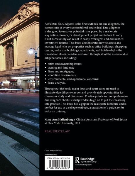 Real Estate Due Diligence is the first textbook on due diligence, the cornerstone of every successful real estate deal. Due diligence is designed to uncover potential risks posed by a real estate acquisition, financing, or development project and failure to carry it out successfully can result in costly oversights and diminished investment returns. This book demonstrates how to assess and manage legal risks on properties such as office buildings, shopping centres, industrial buildings, apartments, and hotels-before the transaction closes. Real estate students and practitioners are taken through all of the essential due diligence areas, including: Titles and ownership issues Zoning and land use Liens and mortgages Condition assessments Environmental and operational concerns And lease analysis Throughout the book, major laws and court cases¿are used to illustrate due diligence issues and provide rich opportunities for classroom study and discussion. Practice points and comprehensive due diligence checklists help readers to go on to put their learning in practice. This book fills a gap in the real estate literature and is perfect for use as a college textbook, a practitioner's guide, or for industry training.