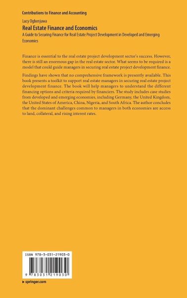 Findings have shown that no comprehensive framework is presently available. This book presents a toolkit to support real estate managers in securing real estate project development finance. The book will help managers to understand the different financing options and criteria required by financiers. The study includes case studies from developed and emerging economies, including Germany, the United Kingdom, the United States of America, China, Nigeria, and South Africa. The author concludes that the dominant challenges common to managers in both economies are access to land, collateral, and rising interest rates.