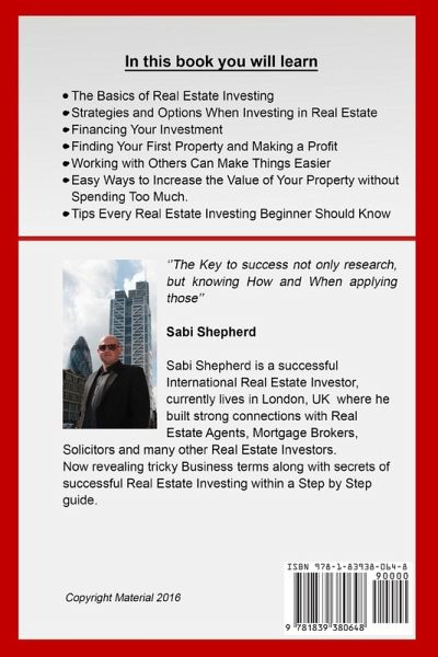 In this informative guide you will gain basic understanding on Real Estate terms in Basic English that will help you prepare for future deals once decided that you will invest in Real Estates. This starter book will provide easy understanding strategies, techniques, and many considerations, when facing options on what type of Real Estate should invest into. Main focus will be on the following topics: -The Basics of Real Estate Investing -Strategies and Options When Investing in Real Estate -Financing Your Investment -Finding Your First Property and Making a Profit -Working with Others Can Make Things Easier -Easy Ways to Increase the Value of Your Property without Spending Too Much -Tips Every Real Estate Investing Beginner Should Know