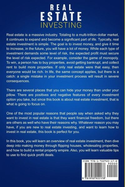 If you don't want to miss out on what thecollegeinvestor.com is saying has created about 90 percent of the world's millionaires, then keep reading... Over the last two centuries, about 90 percent of the world's millionaires have been created by investing in real estate according to the thecollegeinvestor.com. The benefits of real estate investing are many. To name a few, you can: You can build equity for the future You can generate passive income It is a hedge against inflation You can enjoy tax benefits through depreciation You help provide a home for others And much, much more! Whatever reasons you may have, if you are new to real estate investing, and want to learn how to invest in real estate, this book is perfect for you. In this book, you will: Get an overview of real estate investing Dive deep into making money through flipping houses and wholesaling properties Discover how to build a rental property empire Learn valuable tips you can use to find quick profit deals And much, much more! So if you want to learn more about real estate investing, scroll up and click the "add to cart" button!