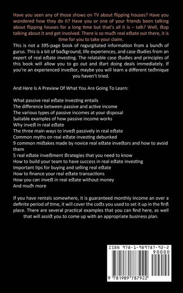 Have you seen any of those shows on TV about flipping houses? Have you wondered how they do it? Have you or one of your friends been talking about flipping houses for a long time but that's all it is - talk? Well, stop talking about it and get involved. There is so much real estate out there, it is time for you to take your claim. This is not a 395-page book of regurgitated information from a bunch of gurus. This is a bit of background, life experiences, and case studies from an expert of real estate investing. The relatable case studies and principles of this book will allow you to go out and start doing deals immediately. If you're an experienced investor, maybe you will learn a different technique you haven't tried. And Here Is A Preview Of What You Are Going To Learn: What passive real estate investing entails The difference between passive and active income The various types of passive incomes at your disposal Suitable examples of how passive income works Why invest in real estate The three main ways to invest passively in real estate Common myths on real estate investing debunked 9 common mistakes made by novice real estate investors and how to avoid them 5 real estate investment strategies that you need to know How to build your team to have success in real estate investing Important tips for buying and selling real estate How to finance your real estate transactions How you can invest in real estate without money And much more If you have rentals somewhere, it is guaranteed monthly income an over a definite period of time, it will cover the costs you used to set it up in the first place. There are several practical examples that you can find here, as well that will assist you to come up with an appropriate business plan.