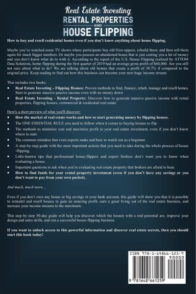 How to buy and resell residential homes even if you don't know anything about house flipping. Maybe you've watched some TV shows where participants buy old fixer-uppers, rebuild them, and then sell them again for much bigger numbers. Or maybe you possess an abandoned house that is just costing you a lot of money and you don't know what do to with it. According to the report of the U.S. House Flipping realized by ATTOM Data Solutions, home flipping during the first quarter of 2019 had an average gross profit of $60,000. Are you still not sure about what to do? We are talking about old homes that create a profit of 38.7% if compared to the original price. Keep reading to find out how this business can become your next huge income stream. This includes two books:Real Estate Investing - Flipping Houses: Proven methods to find, finance, rehab, manage and resell homes. Start to generate massive passive income even with no money down Real Estate Investing - Rental Property: Discover how to generate massive passive income with rental properties, flipping houses, commercial & residential real estate Here's a short preview of what you'll discover:How the market of real estate works and how to start generating money by flipping houses. The ONE ESSENTIAL RULE you need to follow when it comes to buying houses to flip. The methods to minimize cost and maximize profit in your real estate investment, even if you don't know where to start. The common mistakes that even experts make and how to watch out as a beginner. A step-by-step guide with the most important actions that you need to take during the whole process of house-flipping. Little-known tips that professional house-flippers and expert brokers don't want you to know when evaluating a house. Important questions to ask when you're evaluating real estate property that brokers are afraid to hear. How to find funds for your rental property investment (even if you don't have any savings or you don't want to pay from your own pocket). And much, much more... Even if you don't own any house or big savings in your bank account, this guide will show you that it is possible to remodel and resell houses to gain an amazing profit, earn a great living out of the real estate business, and increase your income streams to the maximum. This step-by-step 30-day guide will help you discover which the houses with a real potential are, improve your design and sales skills, and run a successful house-flipping business. If you want to unlock access to this powerful information and discover real estate secrets, then you should start this book today!