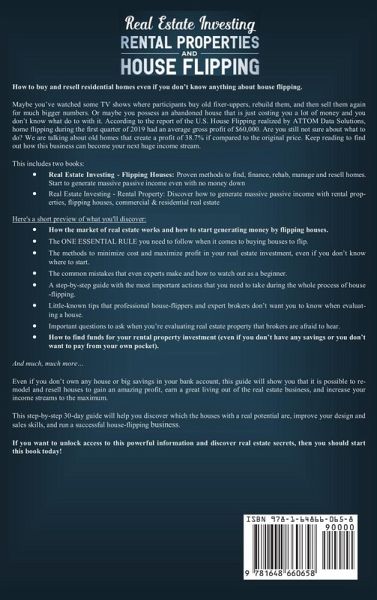 How to buy and resell residential homes even if you don't know anything about house flipping. Maybe you've watched some TV shows where participants buy old fixer-uppers, rebuild them, and then sell them again for much bigger numbers. Or maybe you possess an abandoned house that is just costing you a lot of money and you don't know what do to with it. According to the report of the U.S. House Flipping realized by ATTOM Data Solutions, home flipping during the first quarter of 2019 had an average gross profit of $60,000. Are you still not sure about what to do? We are talking about old homes that create a profit of 38.7% if compared to the original price. Keep reading to find out how this business can become your next huge income stream. This includes two books:Real Estate Investing - Flipping Houses: Proven methods to find, finance, rehab, manage and resell homes. Start to generate massive passive income even with no money down Real Estate Investing - Rental Property: Discover how to generate massive passive income with rental properties, flipping houses, commercial & residential real estate Here's a short preview of what you'll discover:How the market of real estate works and how to start generating money by flipping houses. The ONE ESSENTIAL RULE you need to follow when it comes to buying houses to flip. The methods to minimize cost and maximize profit in your real estate investment, even if you don't know where to start. The common mistakes that even experts make and how to watch out as a beginner. A step-by-step guide with the most important actions that you need to take during the whole process of house-flipping. Little-known tips that professional house-flippers and expert brokers don't want you to know when evaluating a house. Important questions to ask when you're evaluating real estate property that brokers are afraid to hear. How to find funds for your rental property investment (even if you don't have any savings or you don't want to pay from your own pocket). And much, much more... Even if you don't own any house or big savings in your bank account, this guide will show you that it is possible to remodel and resell houses to gain an amazing profit, earn a great living out of the real estate business, and increase your income streams to the maximum. This step-by-step 30-day guide will help you discover which the houses with a real potential are, improve your design and sales skills, and run a successful house-flipping business. If you want to unlock access to this powerful information and discover real estate secrets, then you should start this book today!
