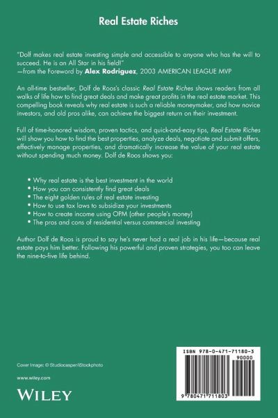 Foreword vii Alex Rodriguez Praise for Real Estate Riches ix Acknowledgments xiii Preface: I Don't Have a Job. Shame! xv Part One Why Is Property So Good? 1 Chapter 1 Four Magic Questions 3 Chapter 2 Conspiracy Theory 19 Chapter 3 A Taxing Issue 27 Chapter 4 Beating the Averages Easily 33 Chapter 5 Yes, But 63 Chapter 6 Summary: Why Invest in Real Estate? 69 Part Two Okay! Show Me How to Do It! 71 Chapter 7 The 100:10:3:1 Rule 73 Chapter 8 Finding Properties 81 Chapter 9 Analyzing Deals 101 Chapter 10 Negotiations and Submitting Offers 109 Chapter 11 Getting High on Opium (aka OPM) 119 Chapter 12 Massively Increase the Value of Your Properties (Without Spending Much Money) 129 Chapter 13 Managing Your Properties 137 Part Three Liftoff! 149 Chapter 14 Residential versus Commercial Property 151 Chapter 15 Government Interference 169 Chapter 16 The Eight Golden Rules of Property 173 Chapter 17 The World Is Your Oyster 181 Appendix: Other Books by Dolf de Roos 187 About the Author 189 Index 191
