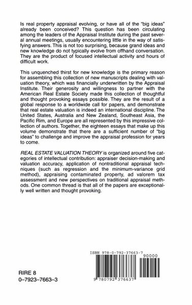 Real Estate Valuation Theory is organized around five categories of intellectual contribution to the whole-appraiser decision making and valuation accuracy, application of nontraditional appraisal techniques such as regression and the minimum-variance grid method, appraising contaminated property, ad valorem tax assessment, and new perspectives on traditional appraisal methods. One common thread is that all of the papers are exceptionally well written and thought provoking.