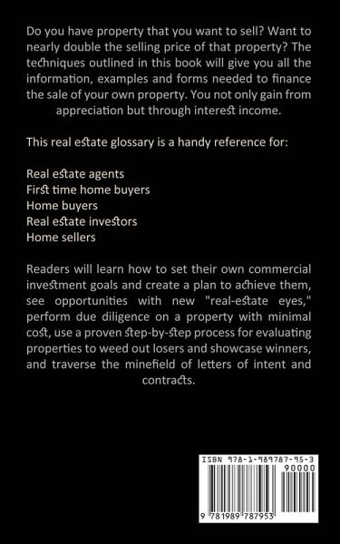 Do you have property that you want to sell? Want to nearly double the selling price of that property? The techniques outlined in this book will give you all the information, examples and forms needed to finance the sale of your own property. You not only gain from appreciation but through interest income. This real estate glossary is a handy reference for: Real estate agents First time home buyers Home buyers Real estate investors Home sellers Readers will learn how to set their own commercial investment goals and create a plan to achieve them, see opportunities with new "real-estate eyes," perform due diligence on a property with minimal cost, use a proven step-by-step process for evaluating properties to weed out losers and showcase winners, and traverse the minefield of letters of intent and contracts.