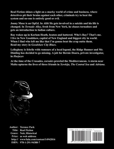 Real Fiction shines a light on a murky world of crime and business, where detectives pit their brains against each other, criminals try to beat the system and no-one is entirely good or evil. Jonny Muse is an OpEd. In Alibi He gets involved in a suicide and his life is changed. In Tornado Alley, fresh from New York, he chases tornadoes and gets an introduction to Indian culture. Ray wakes up in Korlam Heath, beaten and battered. Who's Ray? That's me. I live in New Goodshaw, capital of New England and biggest city in world. When I find who left me like that I'm gonna beat the crap outta them. Read my story in Goodshaw City Blues. Lellegheny is febrile with rumours of a local legend, the Ridge Runner and Mr Dimling has decided to go missing. A job for Bernie Doarn, private investigator, in Harjazes At the time of the Crusades, corsairs prowled the Mediterranean. A storm near Malta upturns the lives of three friends in Xewkija, The Central Sea and Adriana.