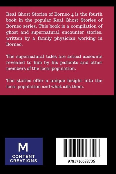 Real Ghost Stories of Borneo 4 is the fourth book in the popular Real Ghost Stories of Borneo. This book is a compilation of ghost and supernatural encounter stories, written by a family physician working in Borneo. The supernatural tales are actual accounts revealed to him by his patients and other members of the local population. The stories offer a unique insight into the local population and what ails them.