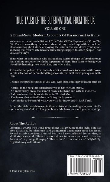 SECOND EDITION NEW FOR OCTOBER 2024 ¿14 Brand-New Accounts of Paranormal Activity. True Ghost Stories - Real Fear! Delve deeper into the unknown with this second edition of True Tales Of The Supernatural From The UK, now featuring two additional dread-inducing stories to stalk your dreams. There's something delicious about sitting curled up with a book of blood-curdling ghost stories enjoying the shivers that run down your spine. Knowing you're safe because these things happen to other people - not you. That's what the folk who shared these stories thought before their own soul-chilling encounters with the supernatural. Here, Tina Vantyler brings you 14 real-life hauntings you won't find anywhere else. So turn the lamp down low, tuck a blanket around your knees and settle down to this selection of nerve-shredding accounts that will make you quake with fear. Get into the spirit of things, if you will, with such chillingly readable tales as: A stroll in the park that turned to terror in On The One Hand... An anniversary break that almost broke a husband and wife in Floored... A dream home that housed a fiend in The Bad Man... The horror that waited below in Going Underground... A reminder to be careful what you wish for in Not In My Back Yard... Expect the nightmarish images in these sinister stories to linger in your mind's eye, leaving you afraid to close your heavy lids, however much you crave sleep. Why not scroll up and hit 'buy' today!
