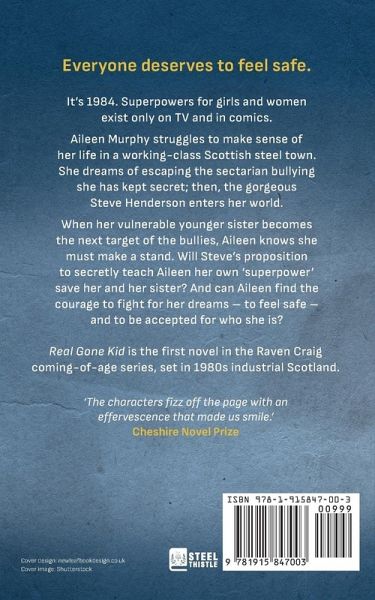 Everyone deserves to feel safe. It's 1984. Superpowers for girls and women exist only on TV and in comics. Aileen Murphy struggles to make sense of her life in a working-class Scottish steel town. She dreams of escaping the sectarian bullying she has kept secret; then, the gorgeous Steve Henderson enters her world. When her vulnerable younger sister becomes the next target of the bullies, Aileen knows she must make a stand. Will Steve's proposition to secretly teach Aileen her own 'superpower' save her and her sister? And can Aileen find the courage to fight for her dreams - to feel safe - and to be accepted for who she is? Real Gone Kid is the feel-good, first novel in the adult, coming-of-age, Raven Craig series, set in 1980s industrial Scotland.