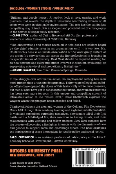 In the struggle over affirmative action, no employment setting has seen more friction than urban fire departments. Thirty years of legal and political efforts have opened the doors of this historically white male preserve, but men of color have yet to consolidate their gains, and women's progress has been even more tenuous. In this unique and compelling account of affirmative action at the "street level," Carol Chetkovich explores the ways in which this program has succeeded and failed. Chetkovich follows the men and women of the Oakland Fire Department Class 1-91 through their academy training and eighteen-month probation. In vivid and sometimes surprising narratives, newcomers tell of their first battle with a full-fledged fire, their reactions to hazing rituals, and their relationships with veterans and fellow trainees. Real Heat explores how the process of becoming a firefighter interacts with the dimensions of race and gender to support some and discourage others. The book examines the implications of these interactions for public policy and social justice.