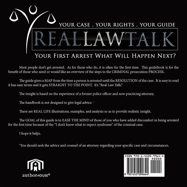 Most people don't get arrested. As for those who do, it is often for the first time. This guidebook is for the benefit of those who need or would like an overview of the steps to the CRIMINAL prosecution PROCESS. The guide gives a MAP from the time a person is arrested until the RESOLUTION of the case. It is easy to read it has easy terms and it gets STRAIGHT TO THE POINT. It's "Real Law Talk." The insight is based on the experience of a former police officer and now practicing attorney. The handbook is not designed to give legal advice. There are REAL LIFE illustrations, examples, and analysis so as to provide realistic insight. The GOAL of this guide is to EASE THE MIND of those of you who have added discomfort in being arrested for the first time because of the "I don't know what to expect syndrome" of the criminal case. I hope it helps.
