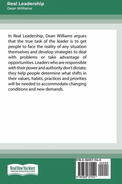 In Real Leadership, Dean Williams argues that the true task of the leader is to get people to face the reality of any situation themselves and develop strategies to deal with problems or take advantage of opportunities. Leaders who are responsible with their power and authority don't dictate; they help people determine what shifts in their values, habits, practices and priorities will be needed to accommodate changing conditions and new demands.