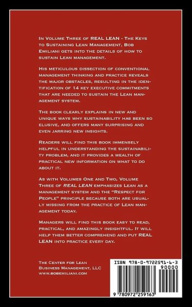 REAL LEAN - The Keys to Sustaining Lean Management (Volume Three), finally answers the question that Lean practitioners have been asking for decades: "How do you sustain Lean management?" Volume 3 of the REAL LEAN book series explains in new and unique ways why sustainability has been so elusive and offers many surprising and even jarring new insights. It dissects conventional management thinking and practice which so strongly hinders managers' ability to become Lean leaders. Major obstacles are revealed, culminating in the identification of 14 key commitments that executives must make in order to sustain the Lean management system. Managers will find this book contains a wealth of practical new information and is amazingly insightful. It will help them better comprehend and put REAL LEAN into practice every day.