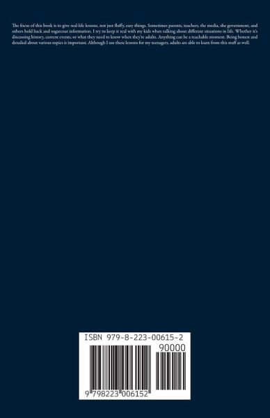 The focus of this book is to give real-life lessons, not just fluffy, easy things. Sometimes parents, teachers, the media, the government, and others hold back and sugarcoat information. I try to keep it real with my kids when talking about different situations in life. Whether it's discussing history, current events, or what they need to know when they're adults. Anything can be a teachable moment. Being honest and detailed about various topics is important. Although I use these lessons for my teenagers, adults are able to learn from this stuff as well.