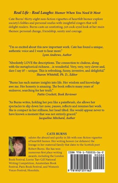 Cate Burns' latest book, Real - Life Real Laughs: Humor When You Need It Most consists of 38 non-fiction vignettes of heartfelt humor that explore drama, vulnerability and adventure from an absurd and quirky point of view. She highlights four themes. Part One, Through the Needle's Eye, examines adjustment: to someone else's toilet habits, to living with no testosterone or estrogen, to feeling a ghost's power over her, to making friends with a large spider. Part Two: Friends? ponders the mysteries of friendship, from people who over-confide to a wild seal who rejects Burns' companionship, to bad communication with a young child. She compares four close relationships with males named Henry. In Part Three, Keeping Sane, Mostly, Burns investigates the limits of experience: fun ways to die, coloring all her clothes and bed sheets red, what happens to noses in dark rooms, and a Countess hairdresser. Being Brave or Not, Part Four, wonders what courage consists of in situations such as: jumping off a cliff, painting a stadium with boxing gloves, or being hooked on bad relationships. She also reveals a dentist's hidden secret. Burns expands personal, non-fiction humor, broadening the base from David Sedaris, Curtis Sittenfeld, Mary Karr, and Augusten Burroughs. In the tradition of authors such as Shel Silverstein, Bill Mauldin, Herman Hesse, William Blake and JRR Tolkien, Burns illustrates many vignettes with her original paintings, drawings or family photos, all in color.