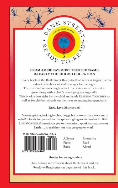 Spooky spiders, lurking leeches, buggy beetles- are they awesome or awful? Decide for yourself in this spine-tingling nonfiction book. Real Live Monsters! Introduces you to the scariest, spookiest creatures on Earth . . . so real they just may creep up on you! ¿FROM AMERICA'S MOST TRUSTED NAME IN EARLY CHILDHOOD EDUCATION More than seventy years of educational research and innovative teaching have given the Bank Street College of Education the reputation as America's most trusted name in early childhood education. Because no two children are exactly alike in their development, we have designed the Bank Street Ready-to-Read series in three levels to accommodate the individual stages of reading readiness of children ages four through eight. • Level 1: GETTING READY TO READ- (PRE-K to GRADE 1) Books are perfect for reading aloud with children who are getting ready to read or are just beginning to read words or phrases. • Level 2: READING TOGETHER-(GRADES 1 to 3) Books are written especiallly for children who are on their way to reading independently but who may need help. • Level 3: I CAN READ IT MYSELF-(GRADES 2 to 3) Books are designed for children able to read on their own. They also can be enjoyed as read-alouds.