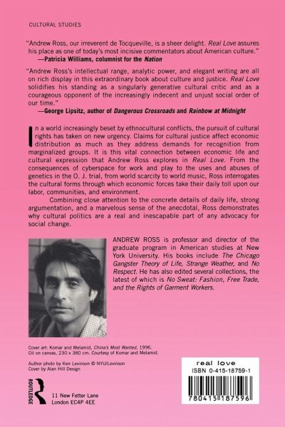 In Real Love, Andrew Ross, one of our preeminent social critics, explores the vital connection between economic life and cultural expression. From the consequences of cyberspace for work and play to the uses and abuses of genetics in the O.J. trial, from world scarcity to world music, Ross interrogates the cultural forms through which economic forces take their daily toll upon our communities and environment. Examining the effects of debates about race, technology, ecology, and the arts on social and legal change, Ross focuses in particular on how demands for certain forms of cultural justice often go hand in hand with injustices of other sorts, and shows why cultural politics are a real and inescapable part of any argument for social change.