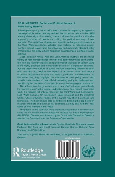 Real Markets: Social and Political Issues of Food Policy Reform contains papers presented at a Seminar on Food Pricing and Marketing Reforms, sponsored by the United Nations Research Institute for Social Development (UNRISD) and held in Geneva during November 1989.