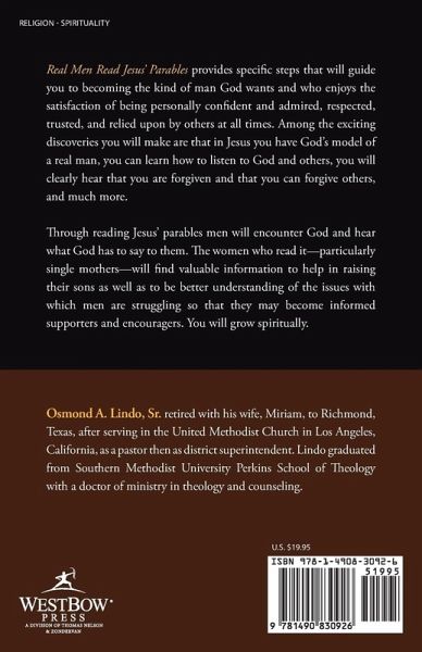 Real Men Read Jesus' Parables provides specific steps that will guide you to becoming the kind of man God wants and who enjoys the satisfaction of being personally confident and admired, respected, trusted, and relied upon by others at all times. Among the exciting discoveries you will make are that in Jesus you have God's model of a real man, you can learn how to listen to God and others, you will clearly hear that you are forgiven and that you can forgive others, and much more. Through reading Jesus' parables men will encounter God and hear what God has to say to them. The women who read it-particularly single mothers-will find valuable information to help in raising their sons as well as to be better understanding of the issues with which men are struggling so that they may become informed supporters and encouragers. You will grow spiritually.