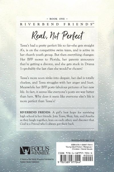 Real, Not Perfect is the first book in a series that travels alongside four friends as they deal with teen life in Riverbend, Indiana. The novel inspires girls and young women to deepen their relationships with God and solve their problems in God-honoring ways. Tessa has lived a trouble-free life as the only child of two loving parents-she is well-liked, gets straight As, is on the competitive swim team, and is active in her church youth group. It's a pretty perfect life! That is, until she comes home from swim practice one day to find that her parents are divorcing. Along with that, her BFF has moved to Florida, and Tessa gets stuck in Intro to Drama-possibly the worst class ever! Soon Tessa's mom sinks into despair and Tessa struggles with her anger and hurt. Meanwhile, her BFF posts fabulous pictures of her new life on Instagram. Tessa thinks that everyone's posts show lives that are way better than the one she has. Why does it seem like everyone else's life is more perfect than hers? Find out how Tessa's new friends from Intro to Drama and Alex, her true-blue friend, help her discover that real is better than perfect.