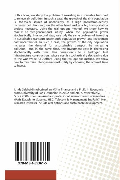 In this book, we study the problem of investing in sustainable transport to relieve air pollution. In such a case, the growth of the city population is the major source of uncertainty, as a high population density increases pollution and, on the other hand, makes a big transportation project necessary. Using the real options method, we show how to maximize inter-generational utility when the population grows stochastically. In a second step, we study the same problem of investing in sustainable transport under both population-growth and investment cost uncertainties. In such a case, the growth of the city population increases the demand for a sustainable transport by increasing pollution, and, in the same time, the investment cost is decreasing stochastically with time. This corresponds to a hydrogen fuel infrastructure construction, whose cost is stochastically decreasing due to the worldwide R&D effort. Using the real options method, we show how to maximize inter-generational utility by choosing the optimal time to invest.
