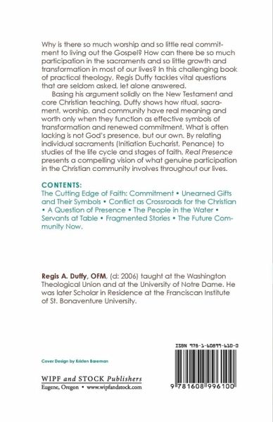 Why is there so much worship and so little real commitment to living out the Gospel? How can there be so much participation in the sacraments and so little growth and transformation in most of our lives? In this challenging book of practical theology, Regis Duffy tackles vital questions that are seldom asked, let alone answered. Basing his argument solidly on the New Testament and core Christian teaching, Duffy shows how ritual, sacrament, worship, and community have real meaning and worth only when they function as effective symbols of transformation and renewed commitment. What is often lacking is not God's presence, but our own. By relating individual sacraments (Initiation Eucharist, Penance) to studies of the life cycle and stages of faith, Real Presence presents a compelling vision of what genuine participation in the Christian community involves throughout our lives. Contents: - The Cutting Edge of Faith: Commitment - Unearned Gifts and Their Symbols - Conflict as Crossroads for the Christian - A Question of Presence - The People in the Water - Servants at Table - Fragmented Stories - The Future Community Now.