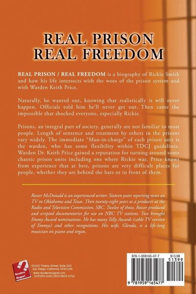 REAL PRISON / REAL FREEDOM is a biography of Rickie Smith and how his life intersects with the woes of the prison system and with Warden Keith Price. Naturally, he wanted out, knowing that realistically it will never happen. Officials told him he'll never get out. Then came the impossible that shocked everyone, especially Rickie. Prisons, an integral part of society, generally are not familiar to most people. Length of sentence and treatment by others in the prisons vary widely. The immediate "Man-in-charge" of each prison unit is the warden, who has some flexibility within TDCJ guidelines. Warden Dr. Keith Price gained a reputation for turning around some chaotic prison units. He knows from experience that at best, prisons are very difficult places for people, whether they are behind the bars or in front of them.