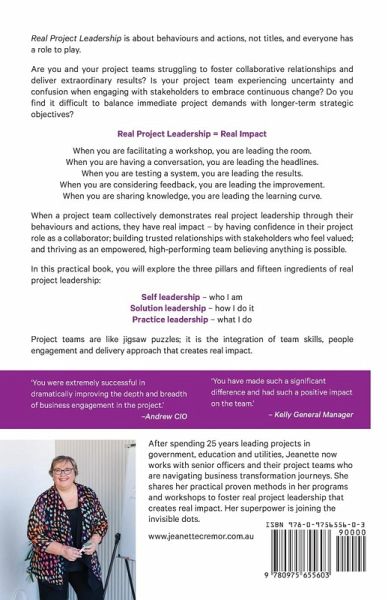 Real Project Leadership is about behaviours and actions, not titles, and everyone has a role to play. Are you and your project teams struggling to foster collaborative relationships and deliver extraordinary results? Is your project team experiencing uncertainty and confusion when engaging with stakeholders to embrace continuous change? Do you find it difficult to balance immediate project demands with longer-term strategic objectives?Real Project Leadership = Real ImpactWhen you are facilitating a workshop, you are leading the room.When you are having a conversation, you are leading the headlines.When you are testing a system, you are leading the results.When you are considering feedback, you are leading the improvement.When you are sharing knowledge, you are leading the learning curve. When a project team collectively demonstrates real project leadership through their behaviours and actions, they have real impact - by having confidence in their project role as a collaborator; building trusted relationships with stakeholders who feel valued; and thriving as an empowered, high-performing team believing anything is possible. In this practical book, you will explore the three pillars and fifteen ingredients of real project leadership:Self leadership - who I amSolution leadership - how I do itPractice leadership - what I do Project teams are like jigsaw puzzles; it is the integration of team skills, people engagement and delivery approach that creates real impact.