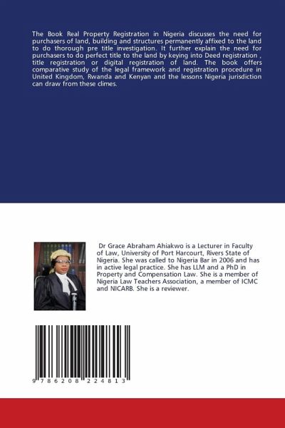 The Book Real Property Registration in Nigeria discusses the need for purchasers of land, building and structures permanently affixed to the land to do thorough pre title investigation. It further explain the need for purchasers to do perfect title to the land by keying into Deed registration , title registration or digital registration of land. The book offers comparative study of the legal framework and registration procedure in United Kingdom, Rwanda and Kenyan and the lessons Nigeria jurisdiction can draw from these climes.