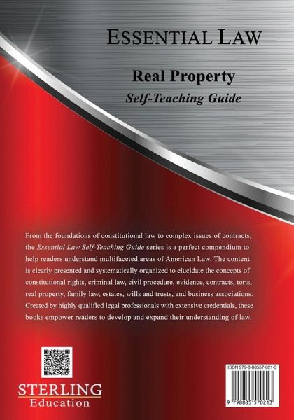 Essential self-teaching guide on real property law. From the foundations of constitutional law to complex issues of contracts, the Essential Law Self-Teaching Guide series is a perfect compendium to help readers understand multifaceted areas of American Law. Created by highly qualified legal professionals with extensive credentials, these books empower readers to expand their understanding of law. The content is a clearly presented and systematically organized review of legal principles governing various areas of law. It elucidates the concepts of constitutional rights, criminal law, civil procedure, rules of evidence, contracts, torts, real property, family law, estates, wills and trusts, and business associations.
