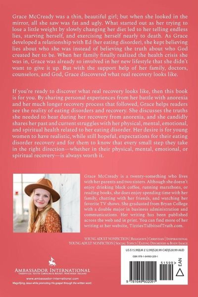 Grace McCready was a thin, beautiful girl; but when she looked in the mirror, all she saw was fat and ugly. What started out as her trying to lose a little weight by slowly changing her diet led to her telling endless lies, starving herself, and exercising herself nearly to death. As Grace developed a relationship with Ed (her eating disorder), she kept believing lies about who she was instead of believing the truth about who God created her to be. When her family finally realized the health crisis she was in, Grace was already so involved in her new lifestyle that she didn't want to give it up. But with the support help of her family, doctors, counselors, and God, Grace discovered what real recovery looks like. If you're ready to discover what real recovery looks like, then this book is for you. By sharing personal experiences from her battle with anorexia and her much longer recovery process that followed, Grace helps readers see the reality of eating disorders and recovery. She discusses the truths she needed to hear during her recovery from anorexia, and she candidly shares her past and current struggles with her physical, mental, emotional, and spiritual health related to her eating disorder. Her desire is for young women to have realistic, while still hopeful, expectations for their eating disorder recovery and for them to know that every small step they take in the right direction-whether in their physical, mental, emotional, or spiritual recovery-is always worth it.