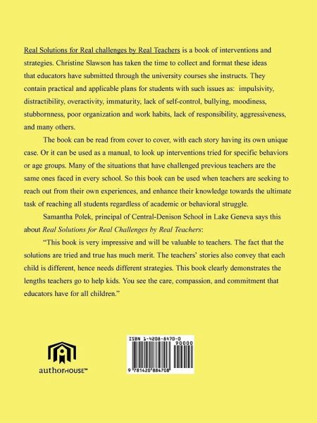 Real Solutions for Real challenges by Real Teachers is a book of interventions and strategies. Christine Slawson has taken the time to collect and format these ideas that educators have submitted through the university courses she instructs. They contain practical and applicable plans for students with such issues as: impulsivity, distractibility, overactivity, immaturity, lack of self-control, bullying, moodiness, stubbornness, poor organization and work habits, lack of responsibility, aggressiveness, and many others. The book can be read from cover to cover, with each story having its own unique case. Or it can be used as a manual, to look up interventions tried for specific behaviors or age groups. Many of the situations that have challenged previous teachers are the same ones faced in every school. So this book can be used when teachers are seeking to reach out from their own experiences, and enhance their knowledge towards the ultimate task of reaching all students regardless of academic or behavioral struggle. Samantha Polek, principal of Central-Denison School in Lake Geneva says this about Real Solutions for Real Challenges by Real Teachers: "This book is very impressive and will be valuable to teachers. The fact that the solutions are tried and true has much merit. The teachers' stories also convey that each child is different, hence needs different strategies. This book clearly demonstrates the lengths teachers go to help kids. You see the care, compassion, and commitment that educators have for all children."