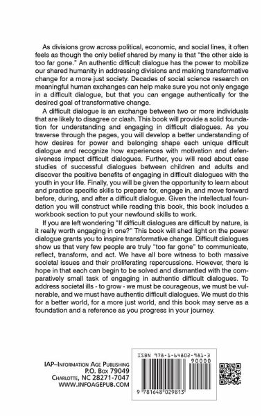 As divisions grow across political, economic, and social lines, it often feels as though the only belief shared by many is that "the other side is too far gone." An authentic difficult dialogue has the power to mobilize our shared humanity in addressing divisions and making transformative change for a more just society. Decades of social science research on meaningful human exchanges can help make sure you not only engage in a difficult dialogue, but that you can engage authentically for the desired goal of transformative change. A difficult dialogue is an exchange between two or more individuals that are likely to disagree or clash. This book will provide a solid foundation for understanding and engaging in difficult dialogues. As you traverse through the pages, you will develop a better understanding of how desires for power and belonging shape each unique difficult dialogue and recognize how experiences with motivation and defensiveness impact difficult dialogues. Further, you will read about case studies of successful dialogues between children and adults and discover the positive benefits of engaging in difficult dialogues with the youth in your life. Finally, you will be given the opportunity to learn about and practice specific skills to prepare for, engage in, and move forward before, during, and after a difficult dialogue. Given the intellectual foundation you will construct while reading this book, this book includes a workbook section to put your newfound skills to work. If you are left wondering "If difficult dialogues are difficult by nature, is it really worth engaging in one?" This book will shed light on the power dialogue grants you to inspire transformative change. Difficult dialogues show us that very few people are truly "too far gone" to communicate, reflect, transform, and act. We have all bore witness to both massive societal issues and their proliferating repercussions. However, there is hope in that each can begin to be solved and dismantled with the comparatively small task of engaging in authentic difficult dialogues. To address societal ills - to grow - we must be courageous, we must be vulnerable, and we must have authentic difficult dialogues. We must do this for a better world, for a more just world, and this book may serve as a foundation and a reference as you progress in your journey.