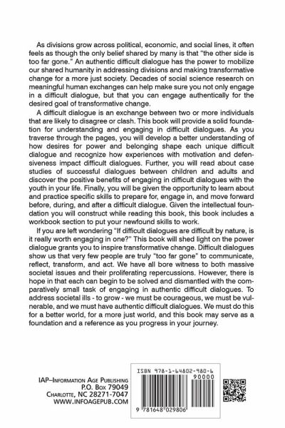 As divisions grow across political, economic, and social lines, it often feels as though the only belief shared by many is that "the other side is too far gone." An authentic difficult dialogue has the power to mobilize our shared humanity in addressing divisions and making transformative change for a more just society. Decades of social science research on meaningful human exchanges can help make sure you not only engage in a difficult dialogue, but that you can engage authentically for the desired goal of transformative change. A difficult dialogue is an exchange between two or more individuals that are likely to disagree or clash. This book will provide a solid foundation for understanding and engaging in difficult dialogues. As you traverse through the pages, you will develop a better understanding of how desires for power and belonging shape each unique difficult dialogue and recognize how experiences with motivation and defensiveness impact difficult dialogues. Further, you will read about case studies of successful dialogues between children and adults and discover the positive benefits of engaging in difficult dialogues with the youth in your life. Finally, you will be given the opportunity to learn about and practice specific skills to prepare for, engage in, and move forward before, during, and after a difficult dialogue. Given the intellectual foundation you will construct while reading this book, this book includes a workbook section to put your newfound skills to work. If you are left wondering "If difficult dialogues are difficult by nature, is it really worth engaging in one?" This book will shed light on the power dialogue grants you to inspire transformative change. Difficult dialogues show us that very few people are truly "too far gone" to communicate, reflect, transform, and act. We have all bore witness to both massive societal issues and their proliferating repercussions. However, there is hope in that each can begin to be solved and dismantled with the comparatively small task of engaging in authentic difficult dialogues. To address societal ills - to grow - we must be courageous, we must be vulnerable, and we must have authentic difficult dialogues. We must do this for a better world, for a more just world, and this book may serve as a foundation and a reference as you progress in your journey.