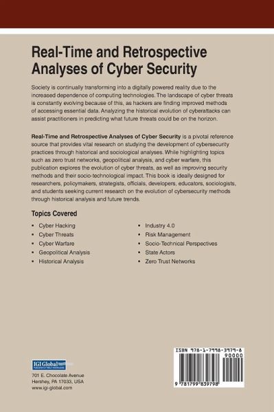 Society is continually transforming into a digitally powered reality due to the increased dependence of computing technologies. The landscape of cyber threats is constantly evolving because of this, as hackers are finding improved methods of accessing essential data. Analyzing the historical evolution of cyberattacks can assist practitioners in predicting what future threats could be on the horizon. Real-Time and Retrospective Analyses of Cyber Security is a pivotal reference source that provides vital research on studying the development of cybersecurity practices through historical and sociological analyses. While highlighting topics such as zero trust networks, geopolitical analysis, and cyber warfare, this publication explores the evolution of cyber threats, as well as improving security methods and their socio-technological impact. This book is ideally designed for researchers, policymakers, strategists, officials, developers, educators, sociologists, and students seeking current research on the evolution of cybersecurity methods through historical analysis and future trends.