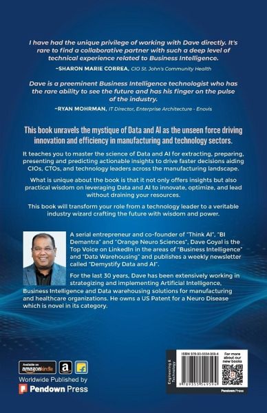 This book unravels the mystique of Data and AI as the unseen force driving innovation and efficiency in manufacturing and technology sectors. It teaches you to master the science of Data and AI for extracting, preparing, presenting and predicting actionable insights to drive faster decisions aiding CIOs, CTOs, and technology leaders across the manufacturing landscape. What is unique about the book is that it not only offers insights but also practical wisdom on leveraging Data and AI to innovate, optimize, and lead without draining your resources. This book will transform your role from a technology leader to a veritable industry wizard crafting the future with wisdom and power. Authored by a serial entrepreneur and co-founder of "Think AI", "BI Demantra" and "Orange Neuro Sciences", Dave Goyal is the Top Voice on LinkedIn in the areas of "Business Intelligence" and "Data Warehousing" and publishes a weekly newsletter called "Demystify Data and AI". For the last 30 years, Dave has been extensively working in strategizing and implementing Artificial Intelligence, Business Intelligence and Data warehousing solutions for manufacturing and healthcare organizations. He owns a US Patent for a Neuro Disease which is novel in its category.