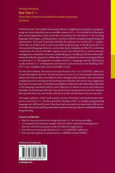 With this book, Christopher Kormanyos delivers a highly practical guide to programming real-time embedded microcontroller systems in C++. It is divided into three parts plus several appendices. Part I provides a foundation for real-time C++ by covering language technologies, including object-oriented methods, template programming and optimization. Next, part II presents detailed descriptions of a variety of C++ components that are widely used in microcontroller programming. It details some of C++'s most powerful language elements, such as class types, templates and the STL, to develop components for microcontroller register access, low-level drivers, custom memory management, embedded containers, multitasking, etc. Finally, part III describes mathematical methods and generic utilities that can be employed to solve recurring problems in real-time C++. The appendices include a brief C++ language tutorial, information on the real-time C++ development environment and instructionsfor building GNU GCC cross-compilers and a microcontroller circuit.