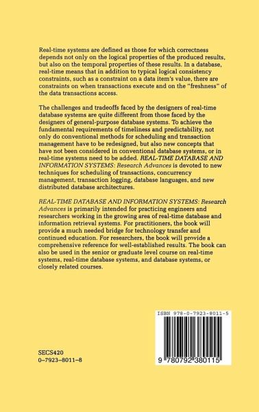 Real-Time Database and Information Systems: Research Advances is primarily intended for practicing engineers and researchers working in the growing area of real-time database and information retrieval systems. For practitioners, the book will provide a much needed bridge for technology transfer and continued education. For researchers, the book will provide a comprehensive reference for well-established results. The book can also be used in a senior or graduate level course on real-time systems, real-time database systems, and database systems, or closely related courses.