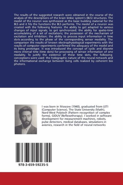 The results of the suggested research were obtained in the course of the analysis of the descriptions of the brain limbic system's (BLS) structures. The model of the neuron was synthesized as the basic building material for the BLS and it fits the functions the BLS performs. The model of a neuron was created with the following features: the ability to get adapted to various changes of input signals, to get synchronized; the ability for spatio-time accumulating of a set of excitations; the possession of the mechanism of excitation and inhibition; the ability to process input information in time slots according to the phase of the corresponding sensor modality. The comparison the results of known electrophysiological experiments with the results of computer experiments confirmed the adequacy of the model and its living prototype. It was introduced the concept of cyclic and discrete micro interval time (time slots) for processing of sensor information of one modality. To justify theexistence of these time slots, the following conceptions were used: the holographic nature of the neural network and the informational exchange between living cells realized by coherent bio photons.