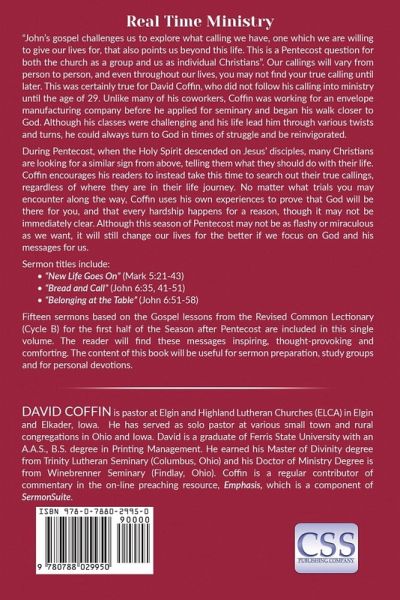"John’s gospel challenges us to explore what calling we have, one which we are willing to give our lives for, that also points us beyond this life. This is a Pentecost question for both the church as a group and us as individual Christians" (59). Our callings will vary from person to person, and even throughout our lives, you may not find your true calling until later. This was certainly true for David Coffin, who did not follow his calling into ministry until the age of 29. Unlike many of his coworkers, Coffin was working for an envelope manufacturing company before he applied for seminary and began his walk closer to God. Although his classes were challenging and his life lead him through various twists and turns, he could always turn to God in times of struggle and be reinvigorated. During Pentecost, when the Holy Spirit descended on Jesus’ disciples, many Christians are looking for a similar sign from above, telling them what they should do with their life. Coffin encourages his readers to instead take this time to search out their true callings, regardless of where they are in their life journey. No matter what trials you may encounter along the way, Coffin uses his own experiences to prove that God will be there for you, and that every hardship happens for a reason, though it may not be immediately clear. Although this season of Pentecost may not be as flashy or miraculous as we want, it will still change our lives for the better if we focus on God and his messages for us. Sermon titles include: "New Life Goes On" (Mark 5:21-43) "Bread and Call" (John 6:35, 41-51) "Belonging at the Table" (John 6:51-58) Fifteen sermons based on the Gospel lessons from the Revised Common Lectionary (Cycle B) for the first half of the season after Pentecost are included in this single volume. The reader will find these messages inspiring, thought-provoking and comforting. The content of this book will be useful for sermon preparation, study groups and for personal devotions.