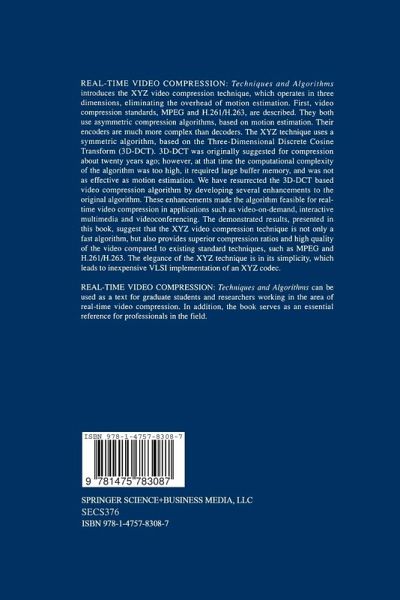 Real-Time Video Compression: Techniques and Algorithms introduces the XYZ video compression technique, which operates in three dimensions, eliminating the overhead of motion estimation. First, video compression standards, MPEG and H.261/H.263, are described. They both use asymmetric compression algorithms, based on motion estimation. Their encoders are much more complex than decoders. The XYZ technique uses a symmetric algorithm, based on the Three-Dimensional Discrete Cosine Transform (3D-DCT). 3D-DCT was originally suggested for compression about twenty years ago; however, at that time the computational complexity of the algorithm was too high, it required large buffer memory, and was not as effective as motion estimation. We have resurrected the 3D-DCT-based video compression algorithm by developing several enhancements to the original algorithm. These enhancements make the algorithm feasible for real-time video compression in applications such as video-on-demand, interactive multimedia, and videoconferencing. The demonstrated results, presented in this book, suggest that the XYZ video compression technique is not only a fast algorithm, but also provides superior compression ratios and high quality of the video compared to existing standard techniques, such as MPEG and H.261/H.263. The elegance of the XYZ technique is in its simplicity, which leads to inexpensive VLSI implementation of any XYZ codec.