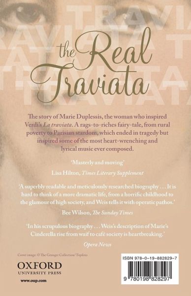 The Real Traviata is the rags-to-riches story of a tragic young woman whose life inspired one of the most famous operas of all time, Verdi's masterpiece La traviata, as well as one of the most scandalous and successful French novels of the nineteenth century, La Dame aux Camelias, by Alexandre Dumas fils. The woman at the centre of the story, Marie Duplessis, escaped from her life as an abused teenage girl in provincial Normandy, rising in an amazingly short space of time to the apex of fashionable life in nineteenth century Paris, where she was considered the queen of the Parisian courtesans. Her life was painfully short, but by sheer willpower, intelligence, talent, and stunning looks she attained such prominence in the French capital that ministers of the government and even members of the French royal family fell under her spell. In the 1840s, she commanded the kind of 'paparazzi' attention that today we associate only with major royalty or the biggest Hollywood stars. Aside from the younger Dumas, her conquests included a host of writers and artists, including the greatest pianist of the century, Franz Liszt, with whom she once hoped to elope. When she died Theophile Gautier, one of the most important Parisian writers of the day, penned an obituary fit for a princess. Indeed, he boldly claimed that she had been a princess, notwithstanding her peasant origin and her distinctly demi-monde existence. And although now largely forgotten, in the years immediately after her death, Marie's legend if anything grew in stature, with her immortalization in Verdi's La traviata, an opera in which the great Romantic composer tried to capture her essence in some of the most heart-wrenching and lyrical music ever composed.