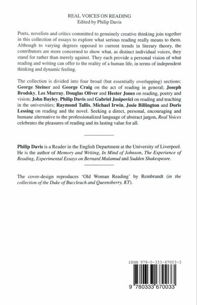 Poets, novelists and critics committed to creative thinking join together in this collection of essays to say what serious reading really means to them as individuals. The collection is divided into four sections: George Steiner and George Craig on the act of reading in general; Joseph Brodsky, Les Murray, Douglas Oliver and Hester Jones on reading, poetry and vision; John Bayley, Philip Davis and Gabriel Josipovici on reading and teaching in the universities; Raymond Tallis, Michael Irwin, Josie Billington and Doris Lessing on reading and the novel.