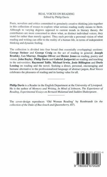 Poets, novelists and critics committed to creative thinking join together in this collection of essays to say what serious reading really means to them as individuals. The collection is divided into four sections: George Steiner and George Craig on the act of reading in general; Joseph Brodsky, Les Murray, Douglas Oliver and Hester Jones on reading, poetry and vision; John Bayley, Philip Davis and Gabriel Josipovici on reading and teaching in the universities; Raymond Tallis, Michael Irwin, Josie Billington and Doris Lessing on reading and the novel.