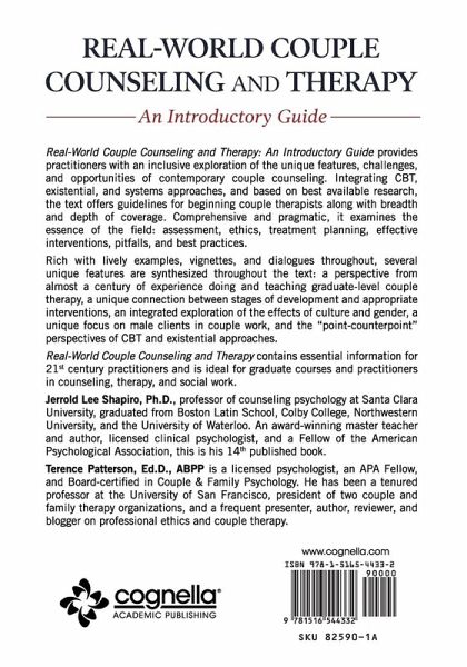 "Real-world couple counseling and therapy: an introductory guide provides practitioners with an inclusive exploration of the unique features, challenges, and opportunities of contemporary couple counseling. Integrating CB, existential, and systems approaches, and based on best available research, the text offers guidelines for beginning couple therapists along with breadth and depth of coverage. Comprehensive and pragmatic, it examines the essence of the field: assessment, ethics, treatment planning, effective interventions, pitfalls, and best practices. Rich with lively examples, vignettes, and dialogues throughout, several unique features are synthesized throughout the text: a perspective from almost a century of experience doing and teaching graduate-level couple therapy, a unique connection between stages of development and appropriate interventions, and integrated exploration of the effects of culture and gender, a unique focus on male clients in couple work, and the "point-counterpoint" perspectives of CBT and existential approaches. Real-world couple counseling and therapy contains essential information for 21st century practitioners and is ideal for graduate courses and practitioners in counseling, therapy, and social work."--Back cover
