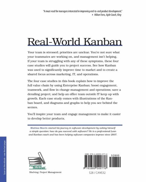 Your team is stressed; priorities are unclear. You're not sure what your teammates are working on, and management isn't helping. If your team is struggling with any of these symptoms, these four case studies will guide you to project success. See how Kanban was used to significantly improve time to market and to create a shared focus across marketing, IT, and operations. Each case study comes with illustrations of the Kanban board and diagrams and graphs to help you see behind the scenes. Learn a Lean approach by seeing how Kanban made a difference in four real-world situations. You'll explore how four different teams used Kanban to make paradigm-changing improvements in software development. These teams were struggling with overwork, unclear priorities, and lack of direction. As you discover what worked for them, you'll understand how to make significant changes in real situations. The four case studies in this book explain how to: * Improve the full value chain by using Enterprise Kanban * Boost engagement, teamwork, and flow in change management and operations * Save a derailing project with Kanban * Help an office team outside IT keep up with growth using Kanban What seems easy in theory can become tangled in practice. Discover why "improving IT" can make you miss your biggest improvement opportunities, and why you should focus on fixing quality and front-end operations before IT. Discover how to keep long-term focus and improve across department borders while dealing with everyday challenges. Find out what happened when using Kanban to find better ways to do work in a well-established company, including running multi-team development without a project office. You'll inspire your team and engage management to make it easier to develop better products. What You Need: This is a case study book, so there are no software requirements. The book covers the relevant bits of theory before presenting the case studies.